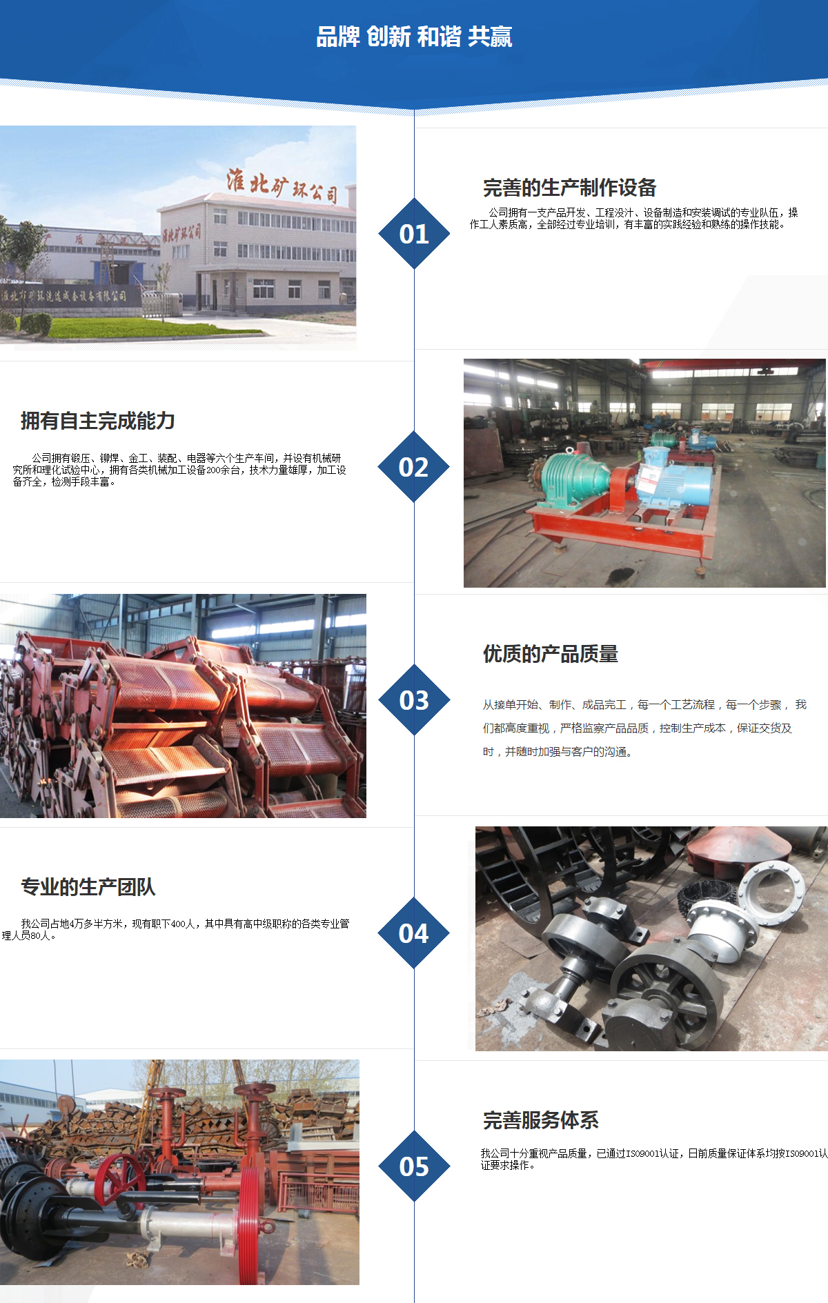 淮北市礦環(huán)洗選成套設(shè)備有限公司(原淮北礦山機(jī)器廠)是經(jīng)改制重組后的新型股份制企業(yè),公司座落在皖北經(jīng)濟(jì)中心——淮北市,東鄰京滬線,北靠隴海線,距徐州民航機(jī)場(chǎng)僅50公里,交通、通訊十分便利。我公司占地4萬(wàn)多半方米,現(xiàn)有職下400人,其中具有高中級(jí)職稱的各類專業(yè)管理人員80人。 公司擁有一支產(chǎn)品開發(fā)、工程沒汁、設(shè)備制造和安裝調(diào)試的專業(yè)隊(duì)伍,操作工人素質(zhì)高,全部經(jīng)過(guò)專業(yè)培訓(xùn),有豐富的實(shí)踐經(jīng)驗(yàn)和熟練的操作技能。公司擁有鍛壓、鉚焊、金工、裝配、電器等六個(gè)生產(chǎn)車間,并設(shè)有機(jī)械研究所和理化試驗(yàn)中心,擁有各類機(jī)械加工設(shè)備200余臺(tái),技術(shù)力量雄厚,加工設(shè)備齊全,檢測(cè)手段豐富。建廠三十多年來(lái),為煤炭、冶金、電力、市政、輕工、化工、建材等行業(yè)提供了大量的通用設(shè)備和專用設(shè)備,深受用戶好評(píng),系皖北地區(qū)的機(jī)械加工中心。我公司十分重視產(chǎn)品質(zhì)量,已通過(guò)ISO900l認(rèn)證,日前質(zhì)量保證體系均按ISO900l認(rèn)證要求操作。